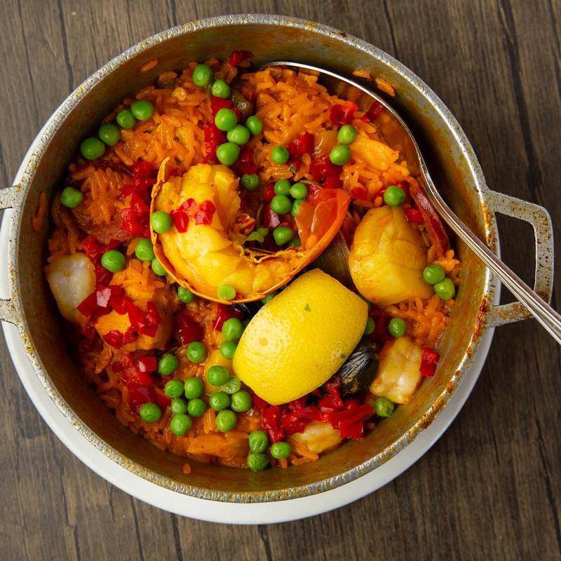 Paella is a Spanish rice dish originally from Valencia and it comes with chorizo, poultry and shellfish